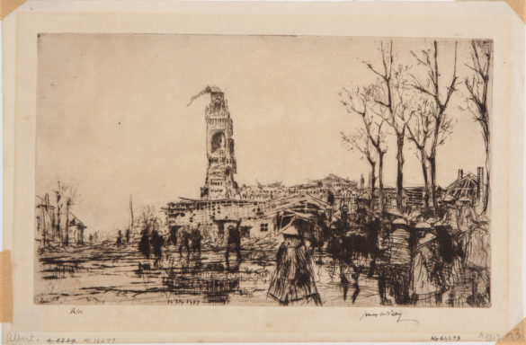 Two things, really – a poem and a picture. The picture, an original etching by official war artist James McBey titled ‘Albert 1st July 1917’ hangs on the wall at my home. It depicts British ‘Toms’ near the cathedral church at Albert, Northern France (the Somme). The statue of the Virgin Mary on the spire was hit by a shell and left hanging. The Germans believed that whoever caused the statue to fall would lose the war. When Albert fell to the German army they used the tower as a look-out post and a British shell did cause the statue to fall along with the German prophesy.
